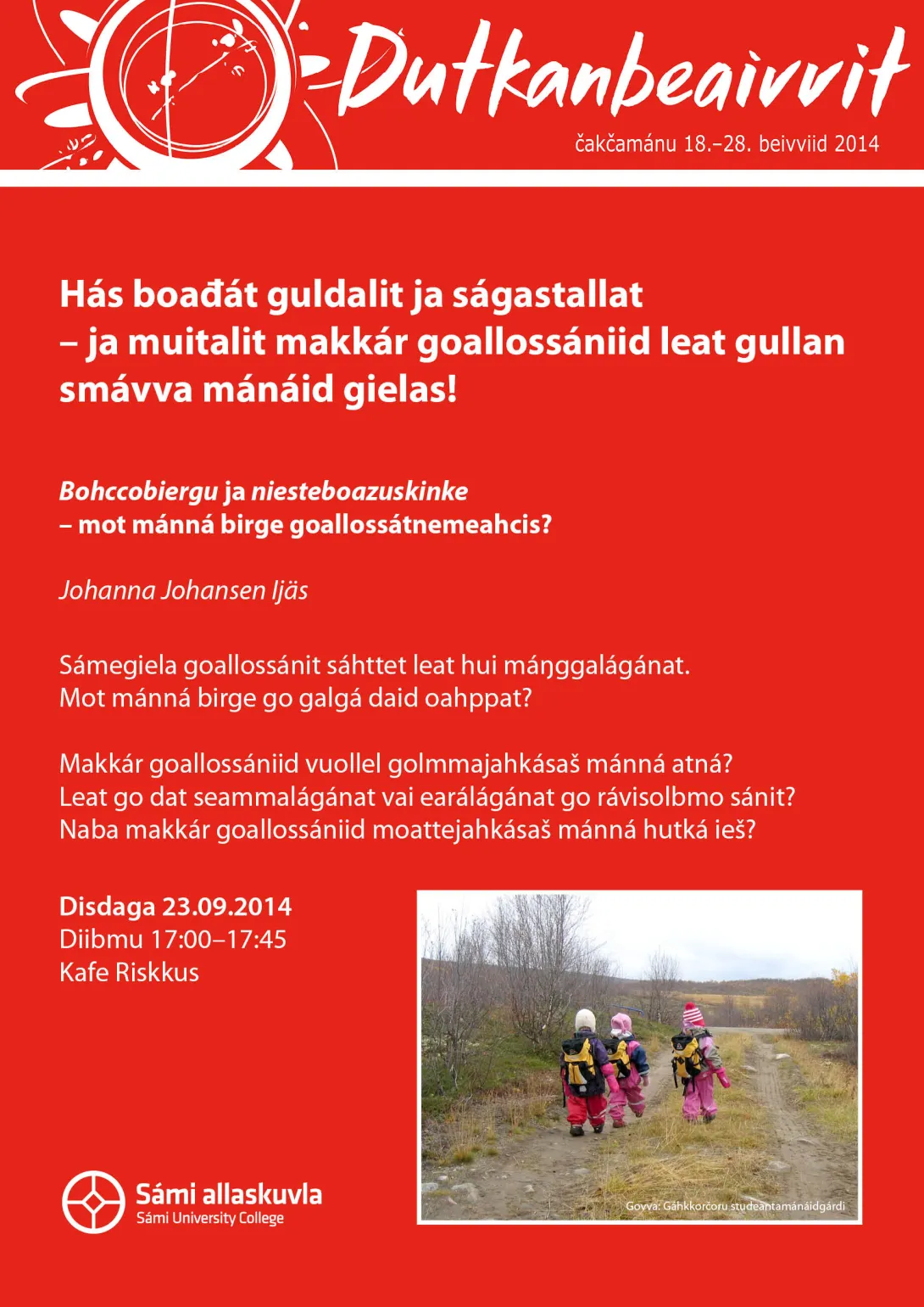 Johanna Johansen Ijäs logaldallá goallosátnegeavaheami birra mánáid gielas. Distaga čakčamánu 23 beaivvis álget Dutkanbeaivvit Sámi allaskuvllas.